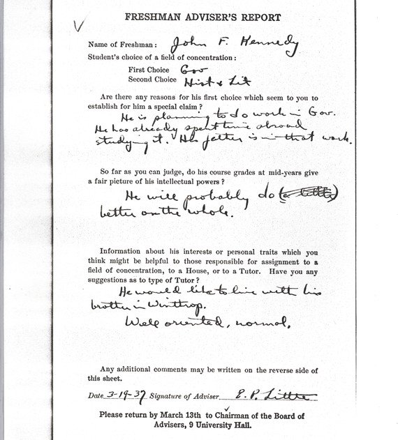 The "well oriented, normal" Harvard freshman has already settled on a career. (John F. Kennedy Presidential Library and Museum)