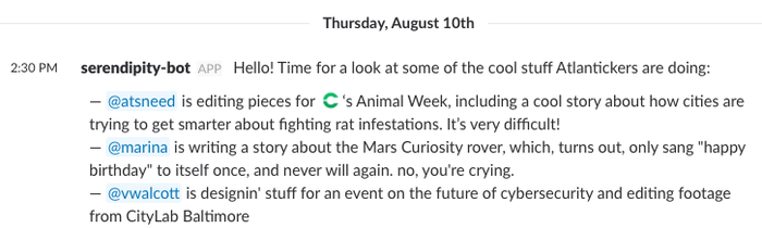 At The Atlantic, we’re taking a stab at fostering randomness using Slack, our workplace chatroom. Every day, a bot randomly quizzes a few staffers about what they’re working on. In the afternoon, it posts a little digest. I love seeing it pop up—and “SerendipityBot” has fostered more than a few collaborations. Here’s an example: