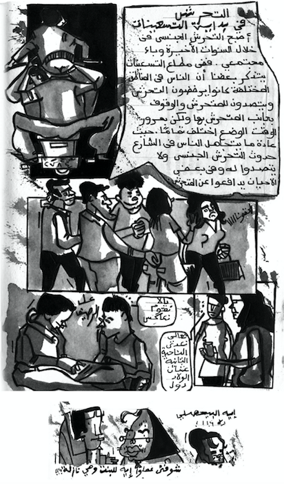 Other cartoonists at the festival approached their subjects with bare fists, particularly when it comes to gender politics in Egypt. In Traveler's Diary, Mai Koraiem uses a rough, expressive inkwash technique to detail the history of women's rights in Egypt and the Middle East. Through a journalistic narrative, Koraiem tells the story of the ascendance of a violent misogynist culture, and the unraveling of liberal feminist values she argues first found purchase in Cairo in the 1960s. In a small ongoing thread at the bottom of the page, Koraiem links the personal and political by including a comic strip narrating her own experiences with street harassment and sexual assault.