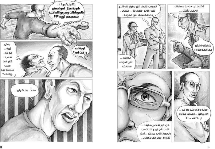 The price of that kind of daring can be high. Ask El Shafee, called by Newsweek “the godfather of Egyptian graphic novelists.” He was arrested by the Mubarak government for publishing Metro, a 2008 graphic novel with political undercurrents. “It is very hard to find a space here that is open to material of all different kinds. Work dealing with sexuality, politics, religion. There is always danger there,” El Shafee says.