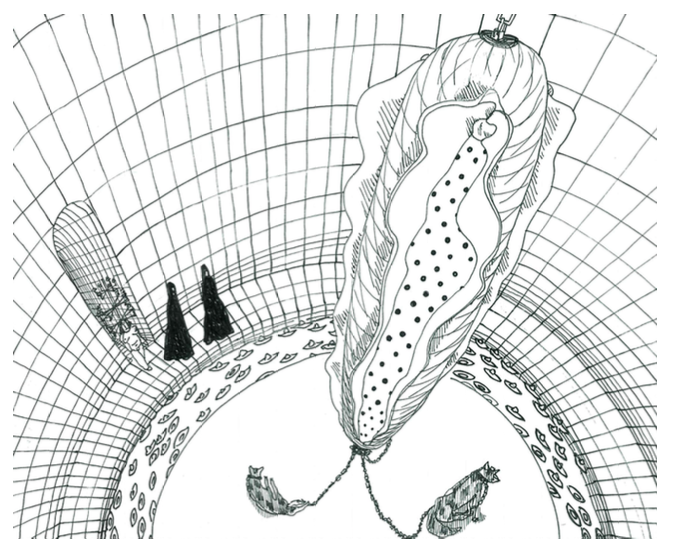 Maurice is in the midst of creating a symbolist graphic novel entitled Alcos. Though its story is opaquely mythic, it reads as a howl against fundamentalist religious conservatism, filled with slender clerics in tall hats and billowing black robes, looming menacingly around the subjugated body of the woman at the center of the tale.