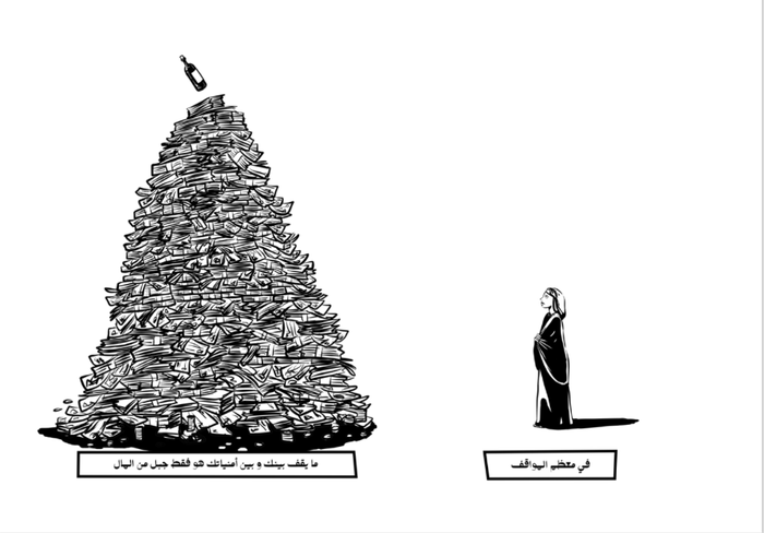 Many of the comics showcased at the festival address the emotional whipsaw of Egypt’s brief political opening. Mostafa Youssef's 2015 graphic novel Ialu is a dystopian fable about a city in which the government literally harvests its citizens’ dreams. The dreams are depicted in Youssef's densely hatched ligne claire hybrid style as iridescent black spheres that emerge from their dreamers' ears in moments of anxiety or despair. The story follows a “dream archivist” who comes to question his role in society. He begins to write his dreams on little paper airplanes, which he launches from high windows like a castaway stuffing messages in bottles. Ialu is a dark and oppressive tale, backlit with a persistent flicker of hope.
