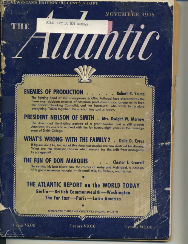 Though the early postwar years are now often remembered as a stable and idyllic era for the American family, Della D. Cyrus contended in a 1946 Atlantic article that family life was in a state of crisis. As families shrank and individuals found more support and satisfaction outside of familial bonds, she wrote, spouses became estranged, parents grew overwhelmed, and children were alternately abandoned or over-mothered. In sum, Cyrus argued, “The family lets people down.”