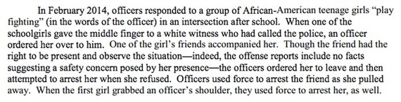 In a statement accompanying the release of the report, outgoing Attorney General Eric Holder offered that the “investigation showed that Ferguson police officers routinely violate the Fourth Amendment in stopping people without reasonable suspicion, arresting them without probable cause, and using unreasonable force against them." The investigation details several incidents that illustrate these violations; here's one representative example: