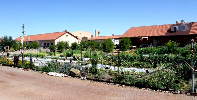 At the top of the campus is the old elementary school, which was built as a ring of single-story classrooms surrounding a courtyard. The central courtyard area has now been replanted as robust gardens of vegetables, flowers and fruits, including special desert-adapted varieties.