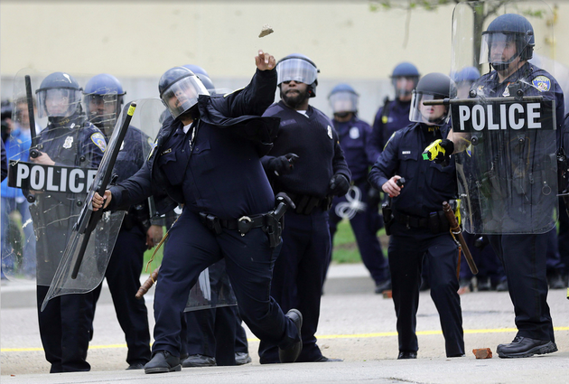 A police officer throws an object at protesters, following the funeral of Freddie Gray. (Patrick Semansky / AP)