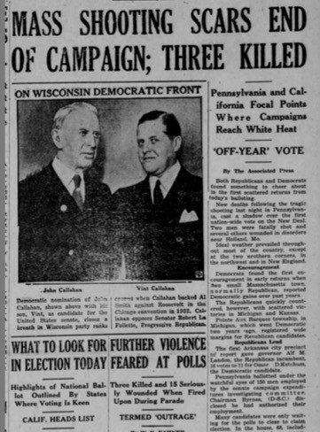 Prior to 1920, all incidences of the phrase “mass shooting” that I could find (using ProQuest and Newspapers.com) were references to shootings that happened in Massachusetts, references to something like “a black fiery mass shooting up into the air,” or the reports of the shooting deaths of persons with the surname “Mass.” The first story I could find about a civilian mass shooting was in 1934, during a political parade in Pennsylvania [seen to the left]. The next was in 1935, when a worker at the Hershey chocolate factory in Pennsylvania ran wild.