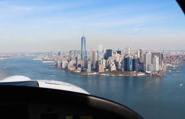 Flying with my daughter over the Hudson River at 800 ft. in a Grumman AA5B Tiger. She took the photo of downtown NYC.
