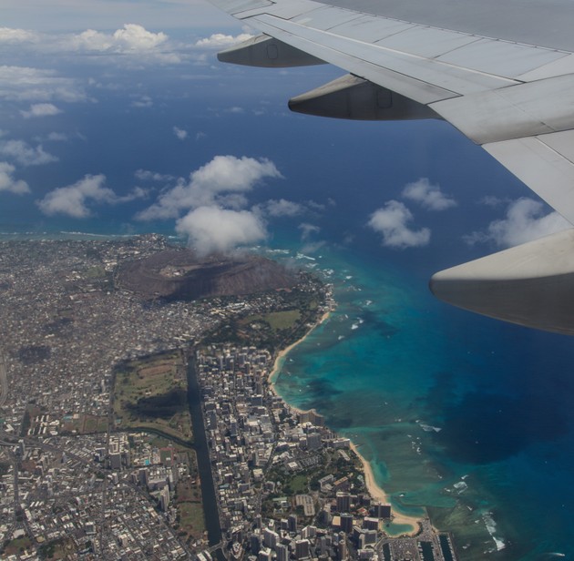 I’m really enjoying your America by Air series and I thought you might enjoy these pictures I grabbed during a Delta 837 flight from Atlanta to Honolulu. After a lot of blue, we reached Hawaii, where I took this picture of Waikiki Beach and Diamond Head.