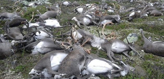 NEWS BRIEF Norway officials have released some gruesome images from a remote region of the country: more than 300 reindeer lay motionless in piles on a barren hillside, seemingly killed in an instant.