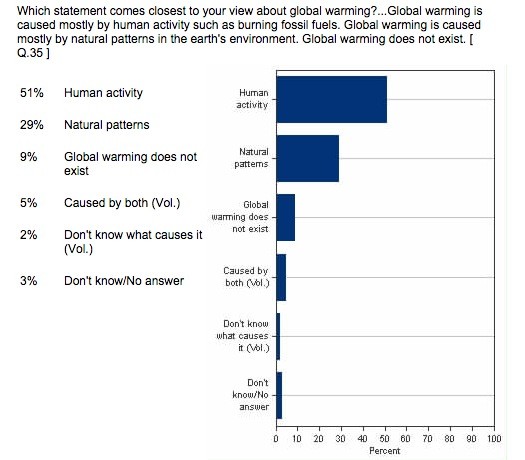 Slightly more than half the population believes (along with most scientists!) that human activity is responsible for warming. This might seem dishearteningly low if you’re inclined to go with the science, but it’s good news for deniers feeling persecuted.