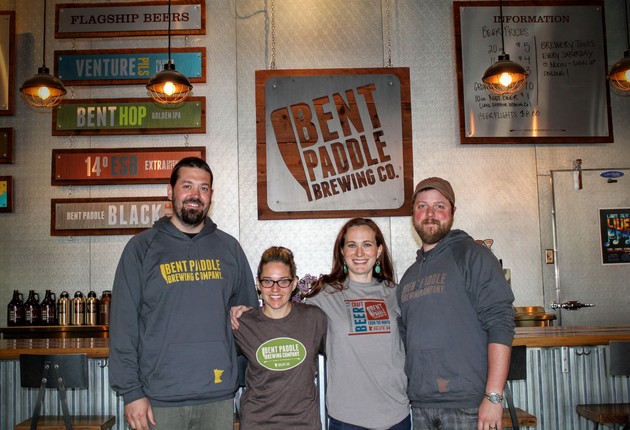 Bryon Tonnis, Karen Tonnis, Laura Mullen, and Colin Mullen, the founders of Bent Paddle Brewing company in Duluth, Minnesota. Their company’s story illustrates the economic patterns that Jeff Alworth is describing. (James Fallows)