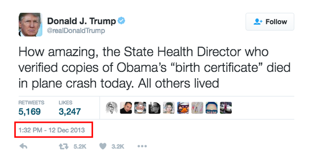 2. I finished it. I finished it.” This is a flat lie. Trump started this phony and racist controversy [or: brought much more attention to what had been a fringe view] and kept it going. (Racist? Yes. As Bernie Sanders pointed out today, Sanders’s own father, like Obama’s, was born overseas. But Sanders said that no one has ever asked him to prove that he was a “real” American.) Even after Trump claimed to have “finished” it with the appearance of Obama’s birth certificate five years ago, Trump has continued to put out Birther tweets and innuendos. You can see a sample at the end of this Vox piece; also here and here. Below is one from December 2013, two years after Trump supposedly “finished” the issue. As of this moment this is still live in Trump’s Twitter feed: