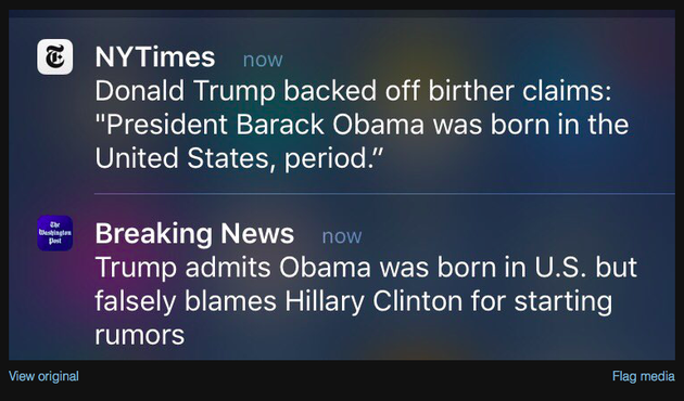 Beutler and I go into details of this in our discussion. But here is an example, the contrasting breaking-news notifications the two papers put out, with the Times at the top and the Post at the bottom.