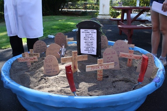 Teams of 2-4 people, many in pioneer garb, build a wagon out of paper and dowel rods before tackling 10 challenges inspired by the computer game—things like floating the wagon across a kiddie pool, shooting at game with nerf guns, competing in a three-legged dysentery race to an outhouse. Instead of finding shelter, we built a tarp tent while volunteers sprayed us with water. We survived being pummeled with pool noodles by roller derby girls at the Platte River station. …