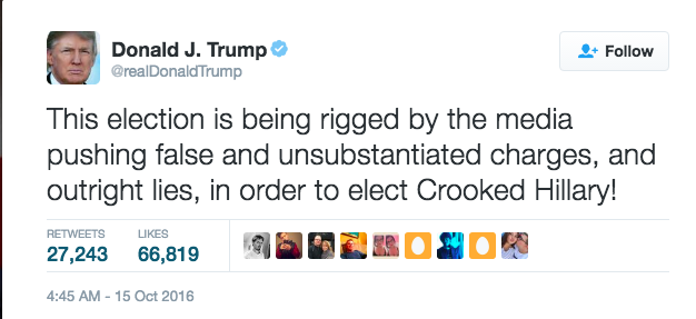 But Trump’s increasing drumbeat of assertions that the only way he could lose the election is if it is “rigged”—too many of “those people” voting in the big cities, the heavy hand of Carlos Slim changing the results, God knows what else—is different, and dangerous. You can read wrapups of what he is doing here and here and here and here, and in a tweetstorm here.