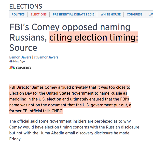 According to the [unnamed former FBI] official, Comey agreed with the conclusion the intelligence community came to: “A foreign power was trying to undermine the election. He believed it to be true, but was against putting it out before the election.” Comey’s position, this official said, was “if it is said, it shouldn’t come from the FBI, which as you’ll recall it did not.”