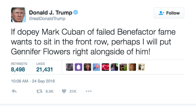 Donald Trump tweeted today that he has invited Gennifer Flowers, subject of controversies involving Bill Clinton’s infidelities when he was governor of Arkansas, to sit in the front row during his first debate next week against Hillary Clinton. This is in apparent retaliation for Hillary Clinton’s reportedly inviting Mark Cuban, anti-Trump billionaire, to sit at the debate.