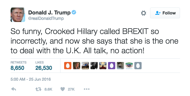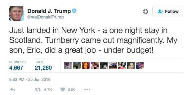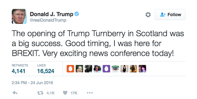 The Tweet above shows the reaction by the presumptive Republican nominee, on landing in Scotland to promote his golf resort, after the historic Brexit vote.