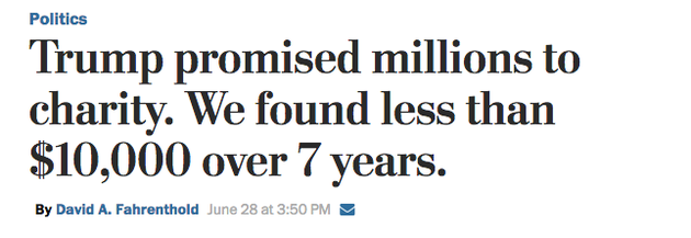 Now, one possibility is that Trump actually made all his promised donations, and the Post simply failed to track down the recipients. The other possibility is that Trump claimed to be a big donor and never followed through.