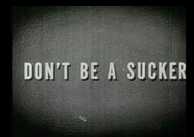 This one really is a time capsule. It’s a nearly 70-year-old U.S. government film called Don’t Be a Sucker, released in 1947 by what was then straightforwardly known as the Department of War. (Thanks to Daniel Buk for the lead.)