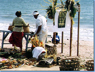![]() October 27, 1999 "The Balinese New Year must begin with complete nothingness," my driver for the day, Wayan Rai, tells me as he squats on the ground in his family's garden preparing coconut rice, "because all existence originates from nothingness." On the roads of Bali nothingness has yet to arrive. It is Galungan, the Balinese New Year's Eve, when people leave the towns to spend the holidays in their home villages. All the motorcycles, cars, and pedestrians jammed in the streets make travel almost impossible. It has taken us nearly three hours to navigate the twenty-five miles to Jimbaran Bay from Ubud, the cultural capital of Bali. Women wearing yellow sarongs and red temple sashes come pouring through the village with pyramids of assorted fruit balanced atop their heads. They congregate at the ocean and lay their food at hastily constructed shrines on the beach. "You can't eat this," Wayan says, pointing at a box of bananas. "You will get in much trouble if you eat before the gods have taken their part."