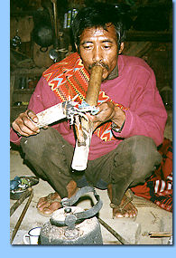 Throughout the northeast, home life in the evenings is conducted around the kitchen hearth. The home we visited was no different, and as we squatted on low cane stools, the rich smell of pork stew surrounded us. Above the hearth was the Konyak Naga bamboo superstructure that rises five feet and forms a dim loft. From it, typically, hang strips and cuts of meat set to cure in the smoke. Tied to the structure were a half-dozen cane baskets. These are placed there for about a fortnight's slow baking, and over time their interweaving strips slowly flex and then bind together in the reflected heat. Between dark dry meats and burnished baskets are wedged all sorts of small pots and containers: collections of small, wild potatoes and purple onions, assortments of herbs, the inevitable sheaves of bamboo shoot, and jars full of beans. This extraordinary array is the living larder of the Naga home. Below it sat the family -- a couple and their two children. With them, as much at ease as a visiting uncle, was the opium peddler. He had brought with him a generous stock of raw opium. This is pure poppy extract, first pressed into a square of linen and dried, and then sliced into small strips, about a centimeter wide by five centimeters long. They are sold in little bundles of ten, for about a hundred rupees, or $2.40 in U.S. dollars. That evening the peddler removed an old cigarette case from inside his pullover. He opened it and shook out the contents: fourteen little stacks of opium strips. He'd arrived in Mon with about twenty; our host had smoked six over the past two days, and was about to embark on his entertainment for the evening with another three. He didn't have very much to do but wait, for his vice was not only home-delivered, but prepared for him as well. With not a trace of self-consciousness, the peddler gently heated the strips in a metal ladle over the kitchen fire. With his free hand, he arranged before him a pan that contained what looked like dark, curly wires. He called the stuff "phallu": grilled remains of a leaf that apparently helps the addict stand the harsh bite of raw opium extract. In a few minutes the opium was off the strips and had turned into a gummy liquid. The peddler stirred the mass and added the phallu. More minutes of steady stirring followed, until the ladle contained a semi-solid cake of smokable opium. When it cooled, the peddler patted the cookie-sized cake a couple of times between his palms and handed it to our host, who carefully placed it on one end of his bamboo hookah. Using an ember from the kitchen fire, he lit the cake and we heard the water inside the hookah bubble as it allowed the narcotic smoke through. He took a deep pull, the children watched us, his wife stirred their dinner, and the peddler began preparing another batch. "This," said Wangsha as we stepped outside for a breath of cold hill air, "is an evening routine in Mon." When the strips come out, stalwarts of the Konyak Mothers' Association curse quietly. The opium turns their children into good-natured zombies who can do nothing to help Mon through its long, isolated winters. When we went in again, the opium smoker welcomed us vigorously and asked his son to fetch a box. From it he brought out something that looked bronze, then spoke to Wangsha.