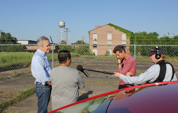 3) Starting later today I'll start a series of posts about the business / industrial complement to those school efforts in the surrounding "Golden Triangle" area of Mississippi. Probably later this week, our partners at Marketplace will run their report on the shift from collapsing, old, lower-wage industries to new higher-wave factories in Mississippi. Here's a view when we were together in Columbus recently: Kai Ryssdal in the red shirt, engineer Charlton Thorp with the gear, and from the back Brenda Lathan of the (very successful) local economic development group, the Golden Triangle Development Link. I am the other person. We're standing in front of a shuttered factory, before going to a newly opened one.