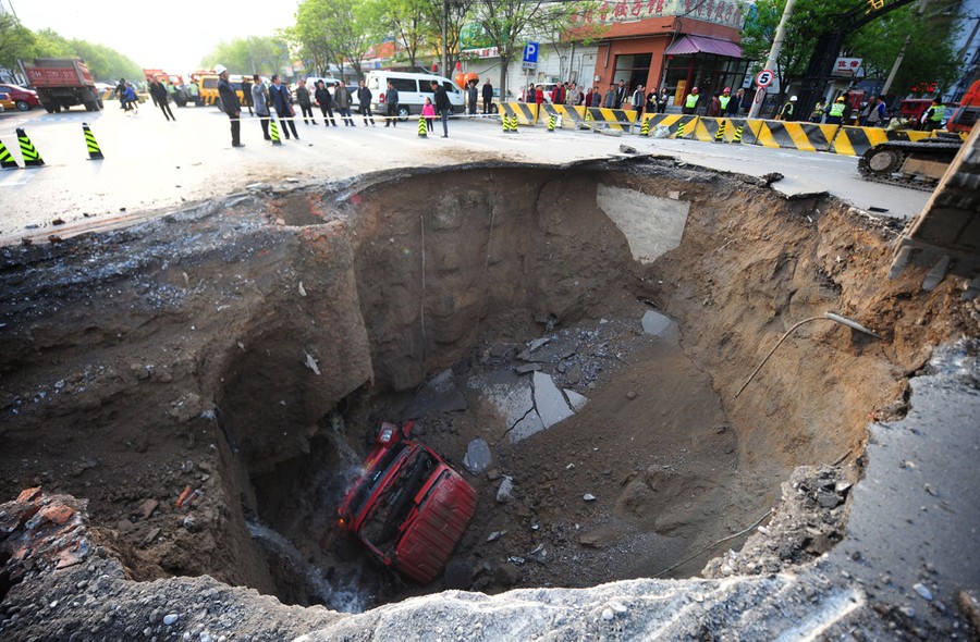 Read moreWorkers block off the site of a huge sinkhole which occurred overnight on Shiliuzhuang road, in Beijing, on on April 26, 2011. A section of the road collapsed beneath a truck, slightly injuring the driver and a passenger, who both jumped out the vehicle before it sank into the hole. An authority suspects the hole was caused by the construction of a subway line. #