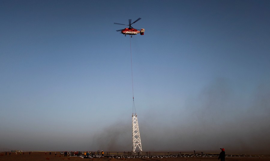 Read moreA helicopter lifts part of an electrical pylon at a construction site of the Qinghai-Tibet power line project in Geermu, Qinghai province, on May 17, 2011. China's overall power consumption in April rose 11.2 percent from a year earlier to 376.8 billion kilowatt hours (kWh), data from the National Energy Administration showed. #
