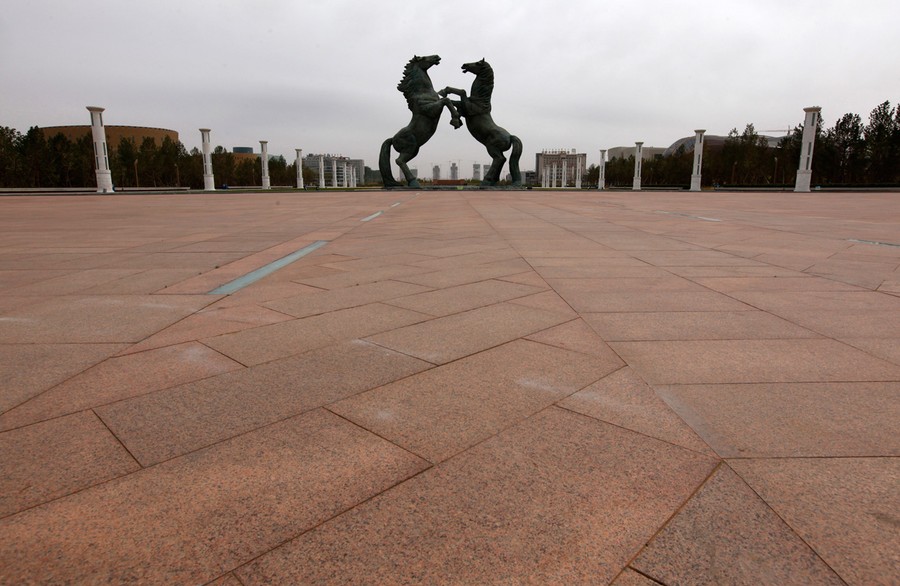 Read moreA large monument depicting fighting horses stands in the main square in the Kangbashi district of the town of Ordos, located around 30 km south of the city of Dongsheng in China's Inner Mongolia Autonomous Region, on May 11, 2011. The Kangbashi district of Ordos, which means 'palaces' in the Mongolian language, is an area filled with thousands of residential apartments and duplex-style homes, built to house mainly workers for the nearby coal mines located just outside the town. However, the estimated one million people that were expected to move into the district's now decaying buildings, have yet to appear. #