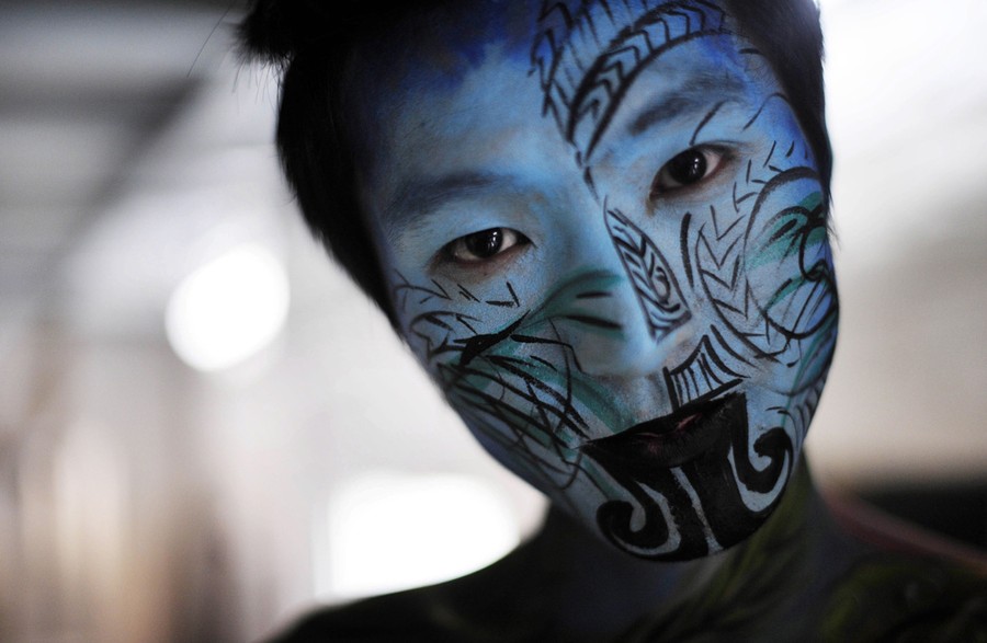 Read moreA model prepares to show off his body painting by New Zealand artist Men Bourk and Chinese painter Ren Zhongni during a body-painting festival in southwest China's Chongqing municipality on May 8, 2011. #