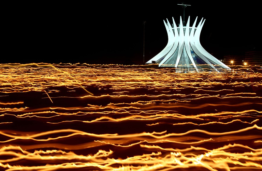 Read moreA long-exposure image shows light trails, produced by faithful carrying candles as they walk past the Cathedral during a Corpus Christi procession in Brasilia, Brazil, on Thursday, June 23, 2011. #
