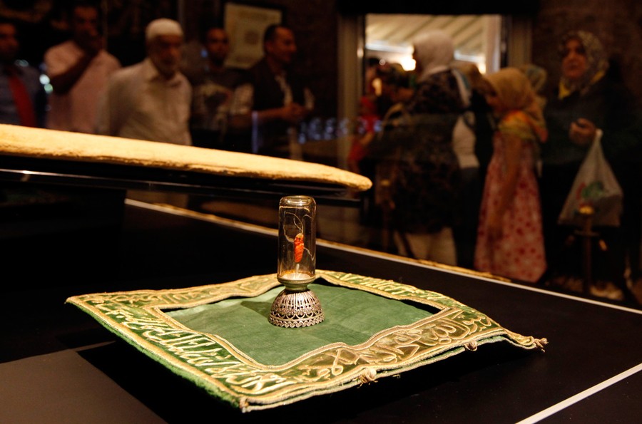 Read moreVisitors stand next to the "Sakal-i Serif", or the holy beard of the Prophet Mohammad (foreground), and Holy Cloak, or the "Hirka-i Serif", as they are exhibited under glass protection at the 18th-century Hirka-i Serif mosque in Istanbul, Turkey, on August 5, 2011. The cloak is unearthed for exhibition every year on the first Friday of Ramadan until the end of the holy month in this mosque. The mosque was built by Sultan Abdulmecit in 1851 for the preservation of the cloak, which Muslims believe was handed over to Uvayis Al-Karani by Prophet Mohammad. #
