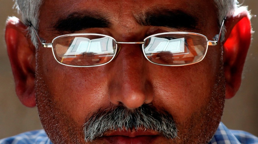 Read moreThe Quran, Islam's holy book, is reflected in the reading glasses of a Muslim man as he reads in a mosque after noon prayer on the first day of the holy month of Ramadan in Amman, Jordan, on August 1, 2011. #