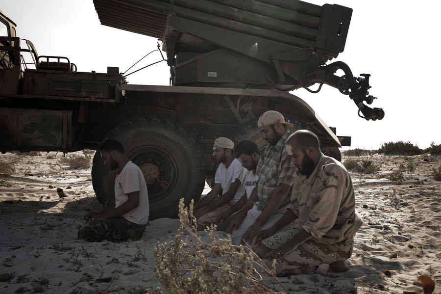 Read moreLibyan rebel fighters pray in the shade of a rocket launcher during the Muslim month of Ramadan, on the outskirts of the coastal oil town of Brega, in eastern Libya, on August 10, 2011, as artillery exchanges took place on the frontlinet. #