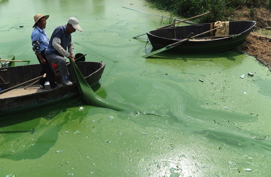 Read moreWorkers try to clean up the blue algae from the Chaohu lake in Hefei, east China's Anhui province, on June 13, 2012. China's environmental authority has warned of the imminent danger of a blue algae outbreak in Chaohu Lake, the country's fifth largest freshwater lake, which is frequently hit by blue algae outbreaks between June and September. #