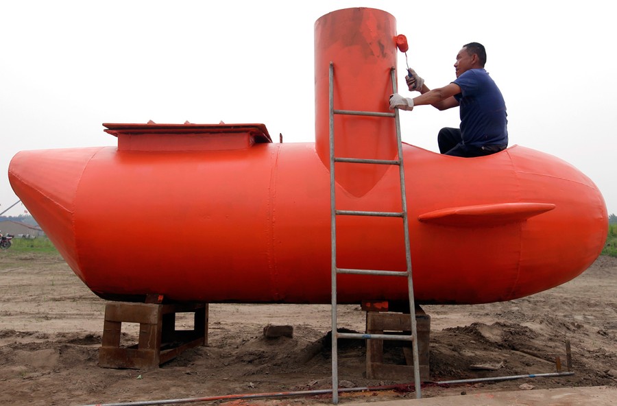 Read moreA worker paints a single-seater submarine designed by Zhang Wuyi and his fellow engineers at a shipyard in Wuhan, Hubei province, on May 7, 2012. Zhang, a 37-year-old local farmer, who is interested in scientific inventions, has made six miniature submarines with several fellow engineers, one of which was sold to a businessman in Dalian at a price of 100,000 yuan ($15,855) last October. The submarines, mainly designed for harvesting aquatic products, such as sea cucumber, have a diving depth of 20-30 meters, and can travel for 10 hours, local media reported. #