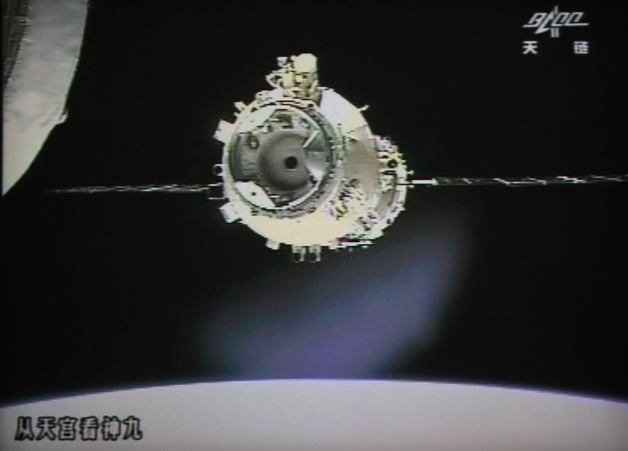 Read moreA photo of the giant screen at the Jiuquan space center shows the Shenzhou-9 spacecraft approaching Tiangong-1 module for automatic docking on July 18, 2012. Three Chinese astronauts entered an orbiting module for the first time, a key step towards the nation's first space station, a move broadcast live on China's state television network, as China aims to complete construction of a space station by 2020, a goal that requires it to perfect docking technology. #