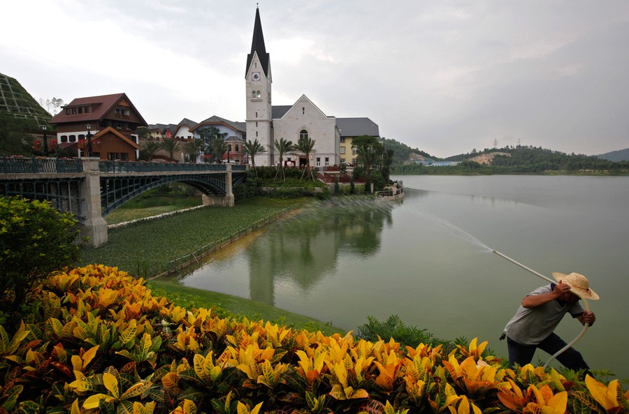Read moreA worker sprays water on plants at an European-style houses in Hallstatt See, a replica of the Austrian town of Hallstatt, in Boluo county, Huizhou city, Guangdong province, on June 2, 2012. A group of Austrians whose scenic mountain village has been copied down to the statues by a Chinese developer attended Saturday's opening in China for the high-end residential project but were still miffed about how the company did it. The original is a centuries-old village of 900 people and a UNESCO heritage site that survives on tourism. The copycat is a housing estate that thrives on China's new rich. In a China famous for pirated products, the replica Hallstatt sets a new standard. #