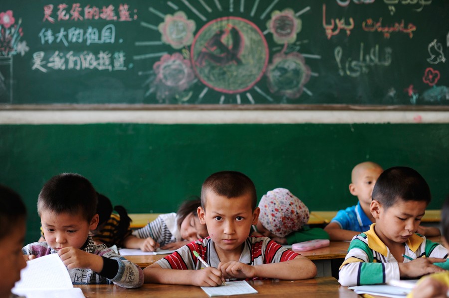 Read moreEthnic minority students study in class as they sit in front of a blackboard at a preschool in Aksu, Xinjiang Uighur Autonomous Region, on June 7, 2012. An emblem of the Chinese Communist Party and part of a slogan which reads: "Great earth is the flowers' cradle, great motherland is our cradle" are visible on the blackboard. #