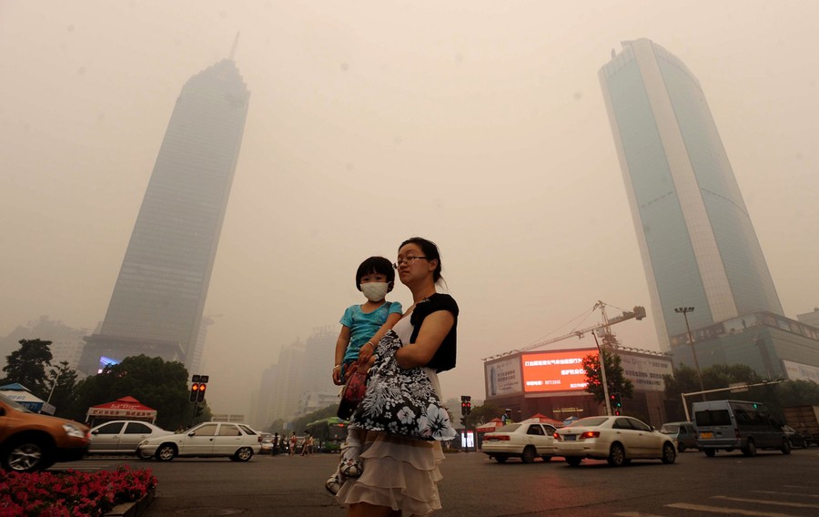 Read moreA woman carries her daughter who is wearing a mask as they make their way along a busy intersection in Wuhan, Hubei province, on June 11, 2012. The Chinese metropolis of Wuhan was blanketed by thick yellowish cloud, raising fears of pollution among its nine million inhabitants, as air pollution is increasingly acute in major Chinese cities and authorities are frequently accused of underestimating the severity of the problem in urban areas, especially in Beijing. #