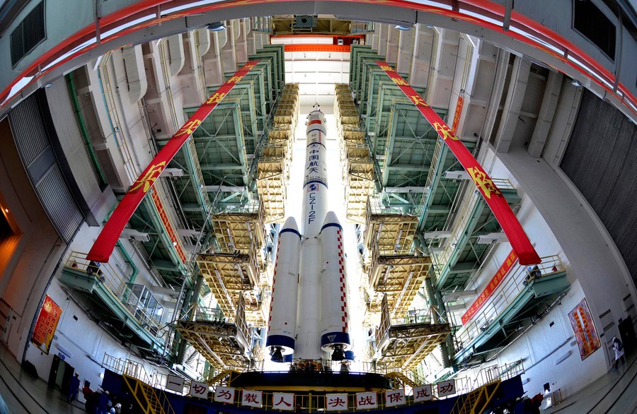Read moreThe Shenzhou-9 manned spacecraft, Long March-2F rocket, and escape tower wait to be transferred to the launch pad at the Jiuquan Satellite Launch Center, Gansu province, on June 9, 2012. #