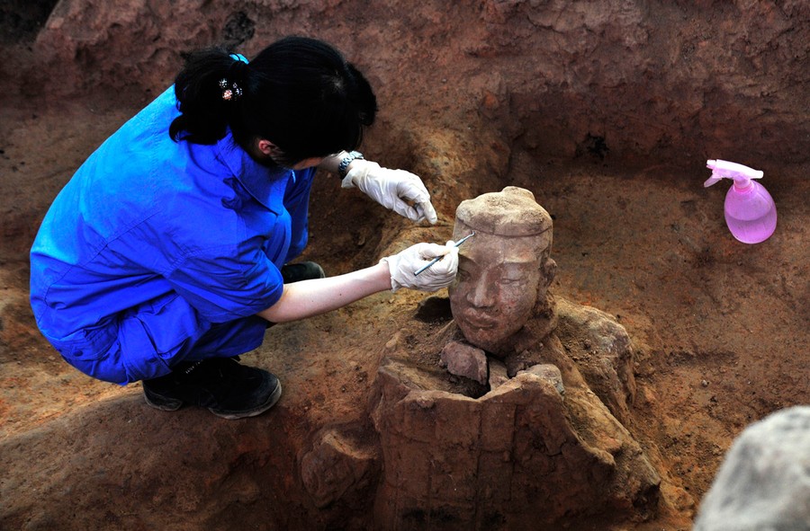 Read moreA member of an archaeology team unearths the head of a terracotta warrior at the excavation site inside the No.1 pit of the Museum of Qin Terracotta Warriors and Horses, on the outskirts of Xi'an, Shaanxi province, on June 9, 2012. It is the first time that shields have been unearthed during an excavation. A large number of the terracotta warriors and horses bear traces of burn marks, which are suspected to have been caused by Xiang Yu, a military leader who rebelled against the Qin Dynasty (221 BC - 207 BC), according to local media. #