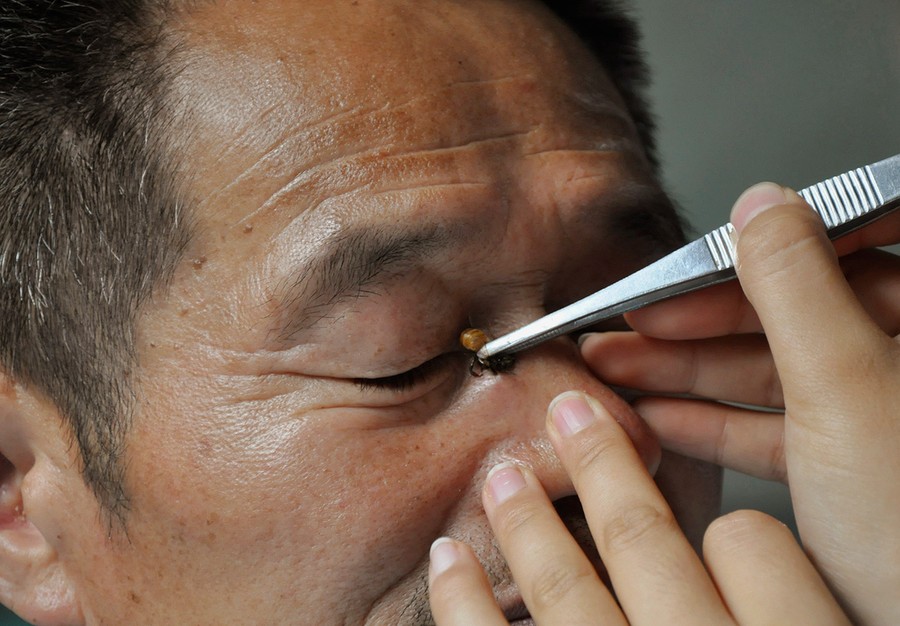 Read moreA patient is stung by a bee as he receives an apitherapy treatment at a hospital in Zhengzhou, Henan province, on June 18, 2012. Apitherapy is one of the ancient methods of curing diseases by using honey, pollen, bee bread, propolis, royal jelly, apilarnil and bee venom. The therapy is claimed to be of use in several types of arthritis, neurological problems such as insomnia, migraine headaches, and neuritis, and skin conditions such as eczema, psoriasis, and herpes. #