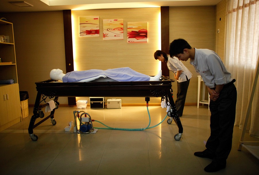 Read moreStudents from Tianquanjiajing Funeral Service school bow in front of a plastic mannequin as they begin an undertaker service class in Jiaxing, Zhejiang province, on May 29, 2012. A new breed of young Chinese undertakers are fighting centuries-old taboos to gain social acceptance for their profession, saying they help the deceased and their families make their final parting with respect. There are more than 1,500 students across the country studying to become undertakers each year. Courses in funeral services take three years to complete and the service includes washing of the dead body as well as providing funeral make-up and dressing. #
