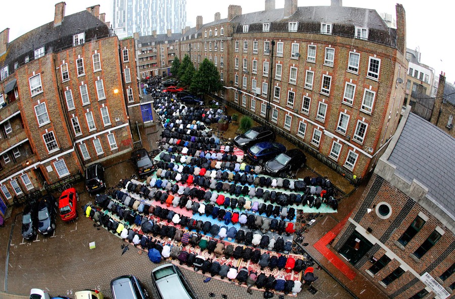 Read moreIn east London, Muslims attend Friday prayers on a rainy first day of Ramadan, in the courtyard of a housing estate next to a small BBC community center and mosque, on July 20, 2012. #