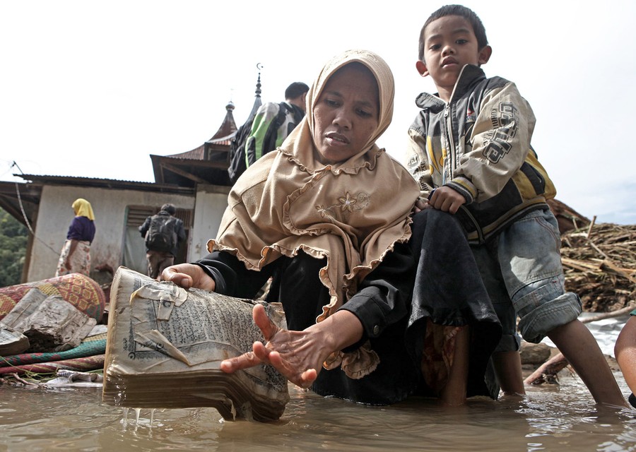 Read moreAn Indonesian woman tries to recover a water-soaked Quran outside a damaged mosque following a flash flood in Padang, the capital of West Sumatra province, on July 25, 2012. Residents were breaking their fast while observing Ramadan on July 24 when floodwaters burst from the river banks following heavy rains, sending people fleeing and damaging hundreds of houses. #