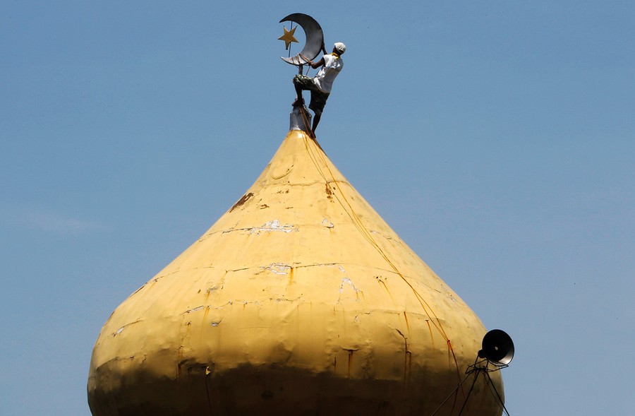 Read moreA worker cleans the crescent moon and star symbol on a dome of a mosque ahead of Eid al-Fitr in Pasay city, metro Manila, Philippines, on August 17, 2012. Eid al-Fitr marks the end of the holy month of Ramadan, and it is a custom to wear colorful traditional attire during this time of celebrations. #