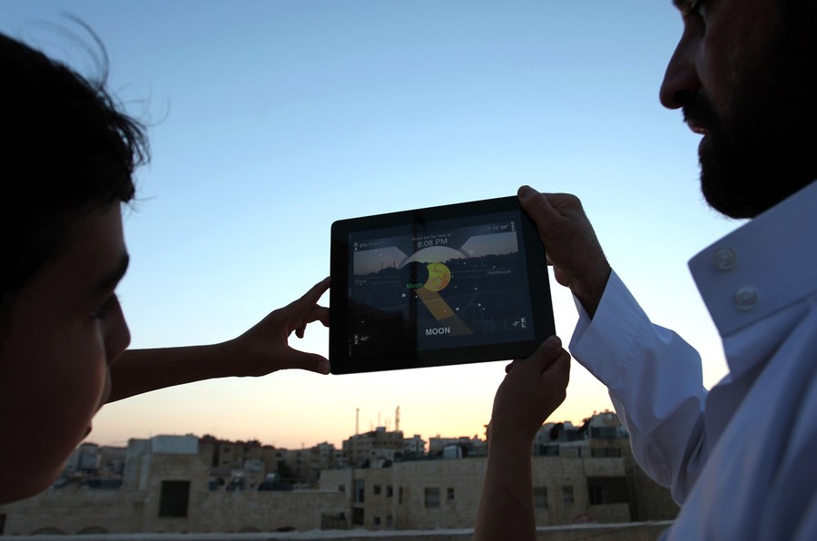 Read moreMajd Osama, 13, shows his father, Osama Shawqi, 41, the crescent moon's course in the sky through an application on his iPad in order to try to locate the crescent of Ramadan in Amman, Jordan, on July 19, 2012. #